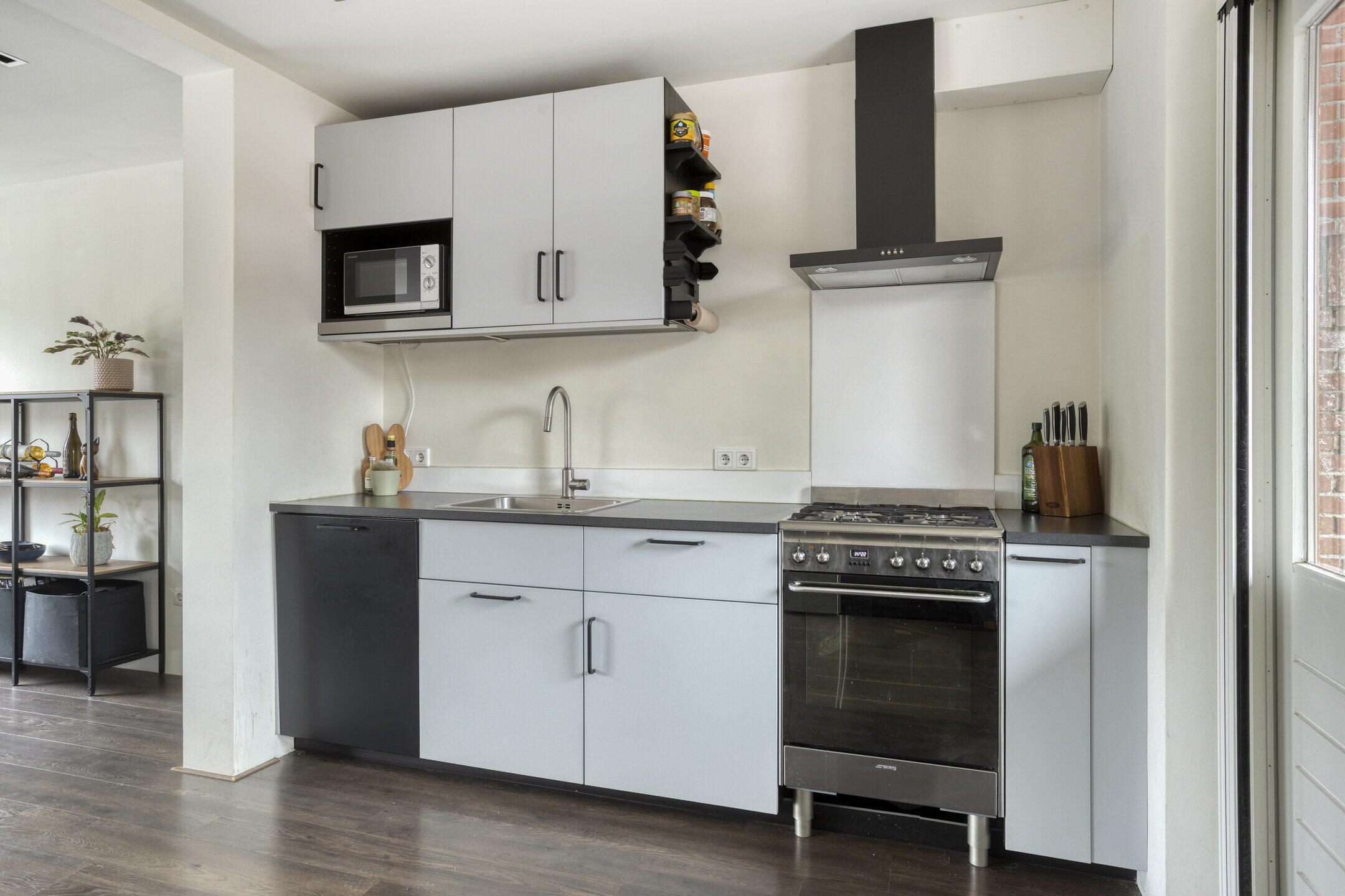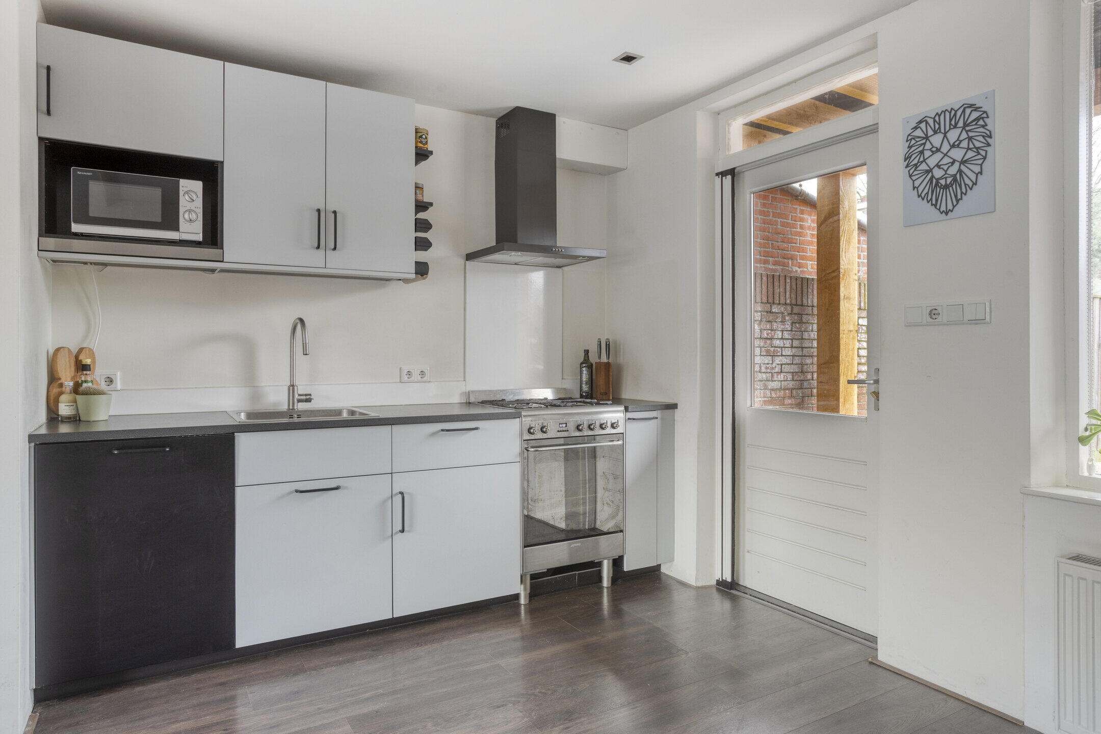 De woonkamer is heerlijk ruim en voelt dankzij de open indeling overzichtelijk en rustig aan. Er is meer dan voldoende plek om een gezellige zithoek te creëren waar je na een lange dag heerlijk kunt ontspannen. De grote raampartijen zorgen voor een prachtige lichtinval, waardoor de ruimte nog groter en frisser oogt. Aan de rechterzijde is volop ruimte voor een sfeervolle eethoek waar je met familie en vrienden uitgebreid kunt tafelen. De open keuken sluit perfect aan op de woonkamer en versterkt het ruimtelijke gevoel. De keuken is netjes afgewerkt en voorzien van alle gemakken. Ook hier geniet je van veel daglicht en via de achterdeur heb je direct toegang tot de tuin – ideaal op zomerse dagen.
